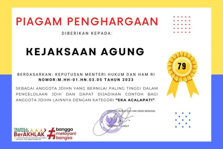 TEROPONGPUBLIK.CO.ID >><< Kejaksaan Agung Republik Indonesia (RI) telah meraih penghargaan bergengsi sebagai Anggota Jaringan Dokumentasi dan Informasi Hukum Nasional (JDIHN) dengan prestasi tertinggi, mengukuhkan posisinya sebagai teladan dalam pengelolaan JDIH. Penghargaan ini diberikan dalam kategori "Eka Acalapati" melalui Piagam Penghargaan berdasarkan Keputusan Menteri Hukum dan Hak Asasi Manusia RI Nomor: M.HH-01.HN.03.05 Tahun 2023.