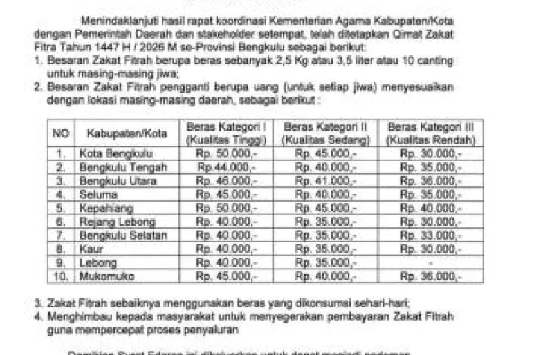 Surat edaran tersebut ditetapkan di Bengkulu pada 3 Maret 2026 dan menjadi pedoman pelaksanaan zakat fitrah di seluruh wilayah Provinsi Bengkulu tahun ini.