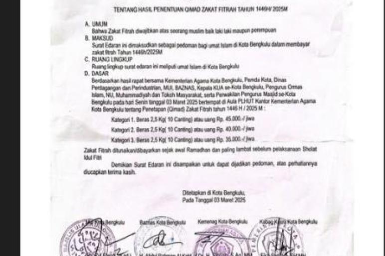 TEROPONGPUBLIK.CO.ID <<<>>> Kementerian Agama (Kemenag) Kota Bengkulu telah menetapkan besaran zakat fitrah yang wajib dibayarkan oleh umat Islam pada bulan Ramadan 1446 H atau tahun 2025. Keputusan ini tertuang dalam Surat Edaran Nomor: B.656.Kk.07.04/BA/03/2025, yang merupakan hasil rapat bersama antara Majelis Ulama Indonesia (MUI) Kota Bengkulu, Badan Amil Zakat Nasional (Baznas), serta pejabat terkait, termasuk Kepala Kemenag dan Kepala Bagian Kesejahteraan Rakyat (Kabag Kesra) Sekretariat Daerah Kota Bengkulu.