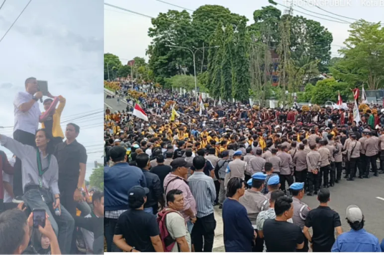 TEROPONGPUBLIK.CO.ID >>><<<< Ribuan mahasiswa dari berbagai perguruan tinggi di Bengkulu memadati halaman gedung DPRD Provinsi Bengkulu, Selasa (2/9). Aksi tersebut berlangsung penuh semangat, disertai yel-yel perlawanan yang menggema di sepanjang jalan. Di tengah situasi yang tegang, Ketua DPRD Provinsi Bengkulu, Sumardi, akhirnya keluar menemui massa dan menerima naskah tuntutan yang mereka bawa.