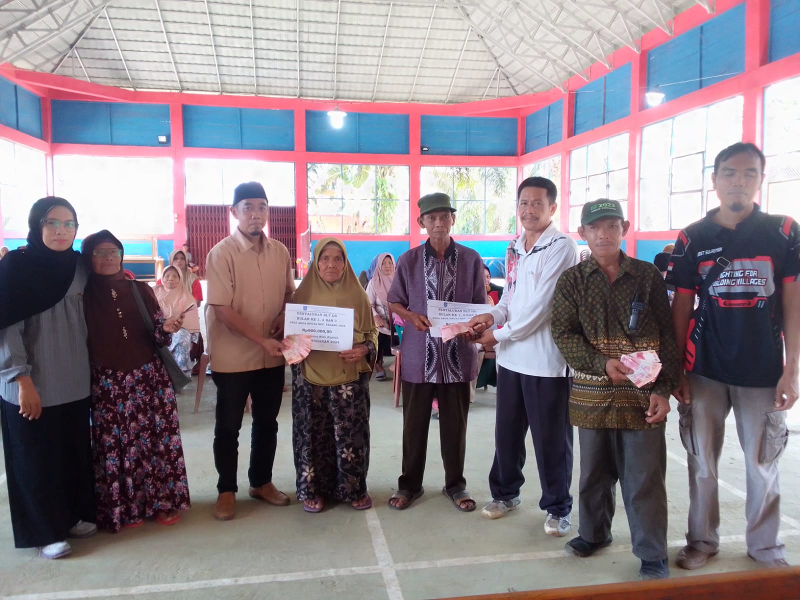 TEROPONGPUBLIK.CO.ID >>><<< Pemerintah Desa Arga Mulya Kecamatan Padang Jaya Kabupaten Bengkulu Utara Propinsi Bengkulu Bersama Ketua BPD beserta anggota, Hari ini Menyalurkan Bantuan BLT DD Tahap 1 Bulan, 1.2 dan 3, tahun 2024, Sebesar Rp 900.000, kepada 30 KPM, kegiatan tersebut di laksanakan di Gedung Patriot Desa Arga Mulya, dihadiri oleh pendamping desa serta undangan lainnya.Jum'at (22/03/2024).