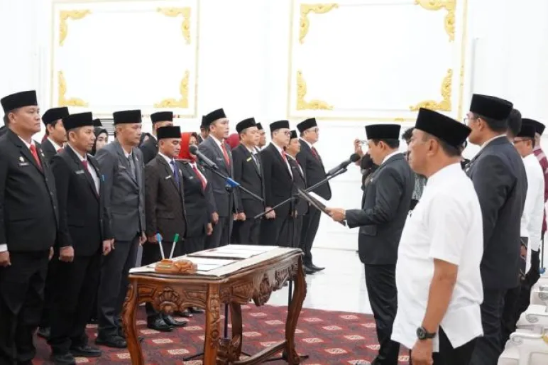 TEROPONGPUBLIK..CO.ID <<<>>> Suasana berbeda terasa di Balai Kota Merah Putih, Kota Bengkulu, Jumat (6/3/2026). Pemerintah Kota Bengkulu menggelar pelantikan puluhan pejabat dalam rangka penyegaran organisasi birokrasi. Sebanyak 44 pejabat resmi dilantik oleh Wali Kota Bengkulu, Dedy Wahyudi, yang terdiri dari pejabat eselon II, III, dan IV.