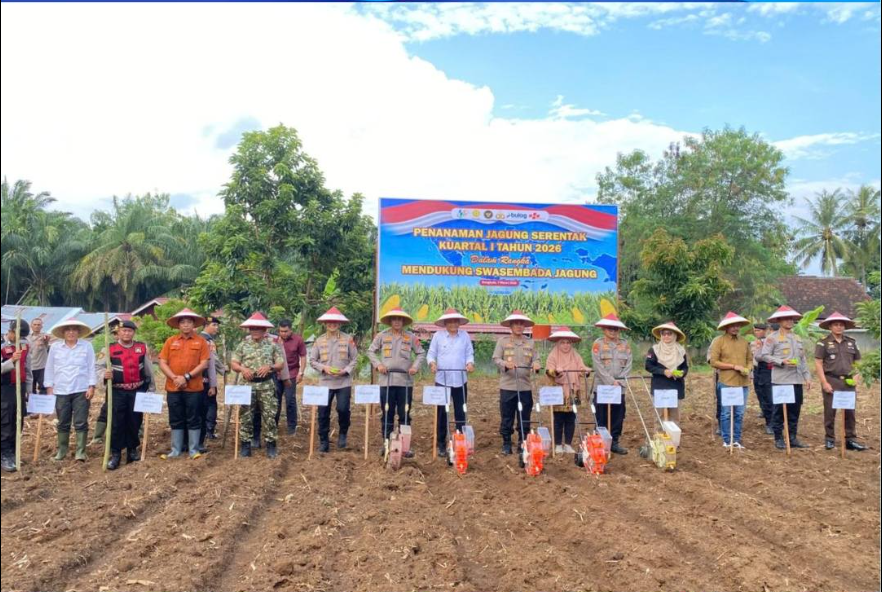 TEROPONGPUBLIK.CO.ID <<<>> Pemerintah Kabupaten Bengkulu Tengah menunjukkan komitmennya dalam mendukung ketahanan pangan nasional dengan menghadiri kegiatan Penanaman Jagung Serentak Kuartal I Tahun 2026 yang digelar oleh Polres Bengkulu Tengah. Kegiatan tersebut berlangsung di halaman Polsek Pondok Kelapa, Kabupaten Bengkulu Tengah, Sabtu (7/3/2026).