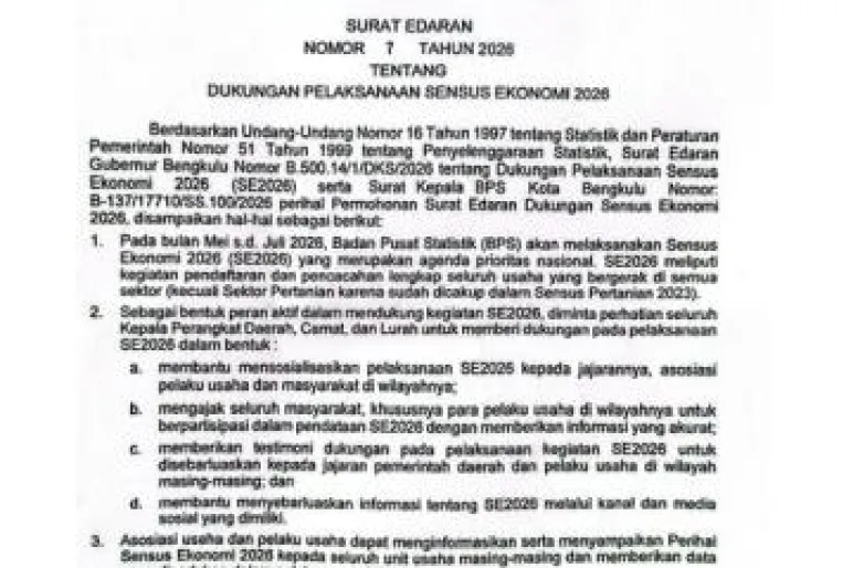 TEROPONGPUBLIK.CO.ID <<<>>> Pemerintah Kota Bengkulu mengeluarkan Surat Edaran Wali Kota Bengkulu Nomor 7 Tahun 2026 tentang dukungan terhadap pelaksanaan Sensus Ekonomi 2026. Kebijakan tersebut diterbitkan sebagai bentuk komitmen pemerintah daerah dalam mendukung pengumpulan data ekonomi yang akurat dan komprehensif di wilayah Kota Bengkulu.