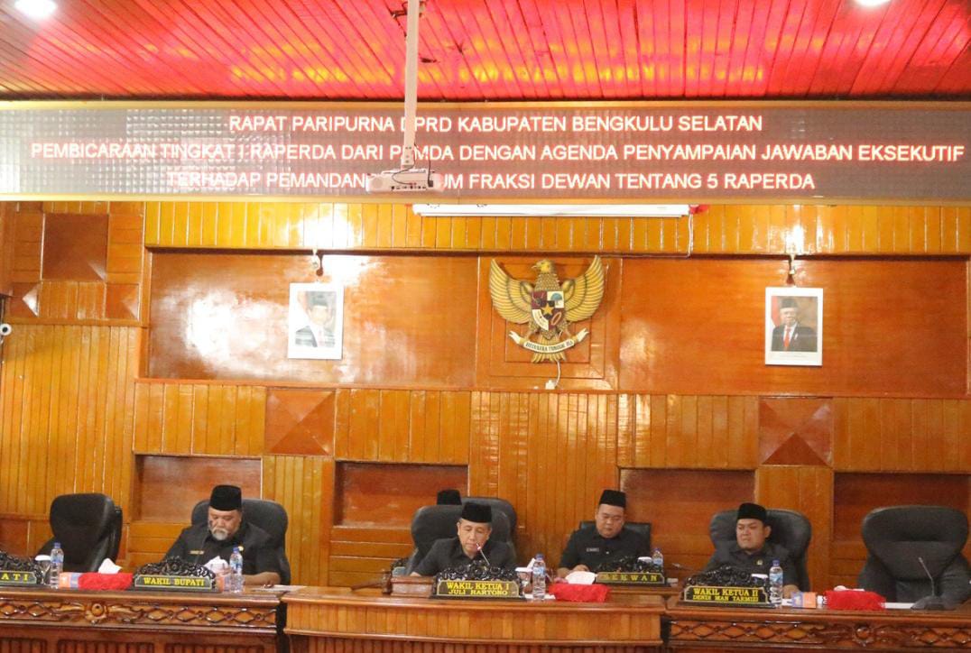 TEROPONGPUBLIK.CO.ID>><< Pada kesempatan tersebut Wabup Bengkulu Selatan Rifa’i Tajuddin menyampaikan tanggapan atau jawaban eksekutif penjelasan terhadap Pemandangan umum Fraksi- fraksi DPRD terhadap 5 Rancangan Perda yakni tentang :