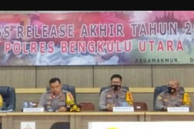 BENGKULU UTARA.TEROPONGPUBLIK.CO.ID-Kapolres AKBP Anton Setyo Hartanto, SIK, MH, pihak polres kabupaten Bengkulu Utara Polda Provinsi Bengkulu, melakukan giat press release kegiatan akhir tahun 2020, bertempat di Aula Amarta Bhayangkara mapolres Bengkulu Utara pada pukul 16.10, Wib. Dalam press release akhir tahun ini Kapolres didampingi Waka polres, Kabag OPS, Kabag Sunda, kasat Reskrim dan dihadiri para perwira tinggi polres Bengkulu Utara lainnya pada hari Rabu, (30/12/2020).