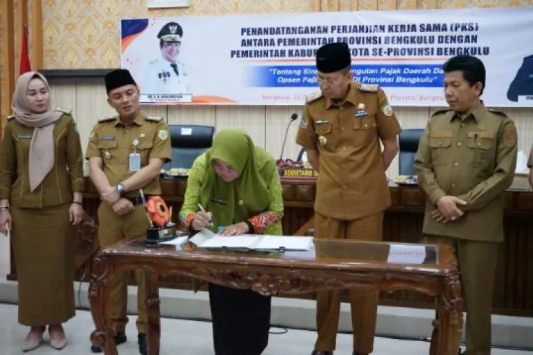 TEROPONGPUBLIK.CO.ID<<<<>>>Pemerintah Provinsi Bengkulu dan pemerintah kabupaten/kota se-Provinsi Bengkulu menandatangani Perjanjian Kerja Sama (PKS) sebagai upaya memperkuat sinergi dalam pemungutan pajak daerah serta opsen pajak daerah, dengan tujuan meningkatkan pendapatan asli daerah (PAD).