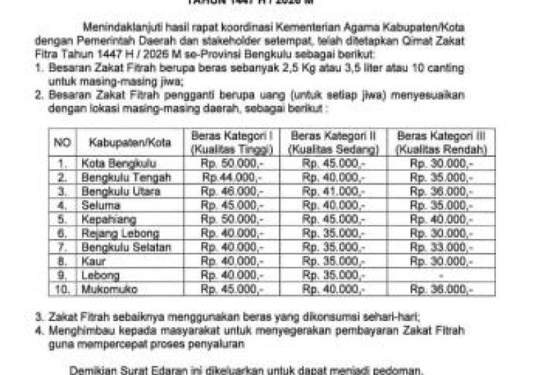 Kemenag Bengkulu Tetapkan Qimat Zakat Fitrah 1447 H/2026 M, Mulai Rp30 Ribu per Jiwa