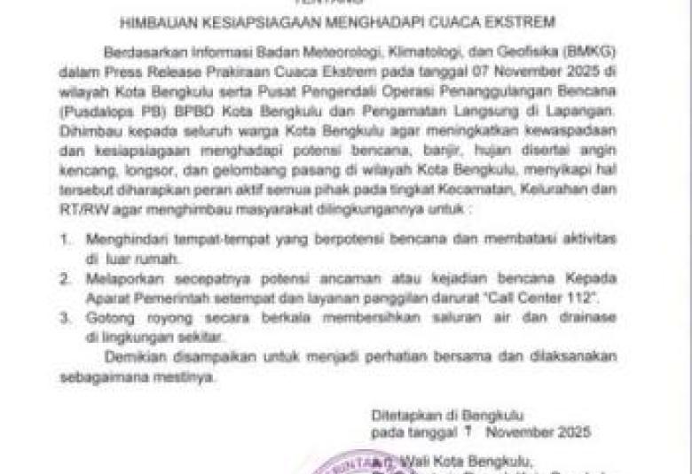 Walikota Bengkulu Imbau Warga Tingkatkan Kesiapsiagaan Hadapi Cuaca Ekstrem