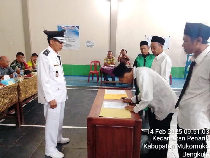 TEROPONGPUBLIK.CO.ID – Setelah melalui tahapan seleksi dan penjaringan, Pemerintah Desa Penarik, Kecamatan Penarik, melantik tiga orang Kepala Dusun (Kadus) yang dinyatakan lolos seleksi. Diantaranya Sugia sebagai Kadus I, Agung Rizky sebagai Kadus II dan Anggi Reskian sebagai Kadus III. Ketiga Kadus ini dilantik langsung oleh Kades Penarik, Supardi pada Jumat (14/2/2025) di Aula kantor desa setempat. Pelantikan Kadus ini juga dihadiri langsung oleh Camat, Khairul Saleh, SKM, MM, BPD dan segenap perangkat desa lainnya.