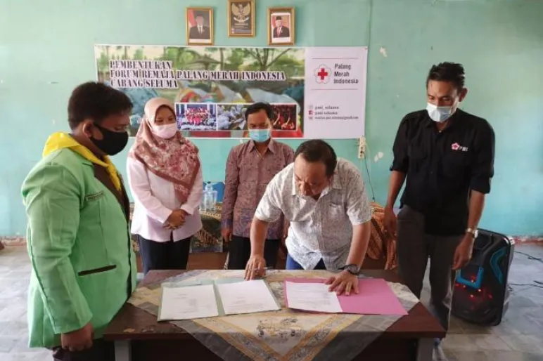 SELUMA.TEROPONGPUBLIK.CO.ID>><< Wakil Bupati Seluma Drs. Gustianto yang juga menjabat sebagai Plt. Ketua Palang Merah Indonesia (PMI) Kabupaten Seluma mengukuhkan Pengurus Forum Remaja Palang Merah Indonesia (FORPIS) Kabupaten Seluma, Minggu (20/6/2021) di Aula Markas PMI Seluma.